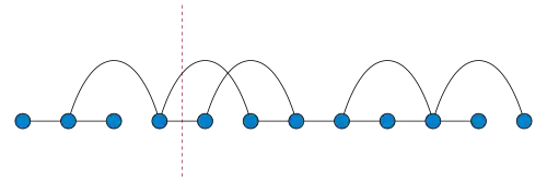 The cutwidth is greater than or equal to the minimum bisection number of any graph. This is minimum possible number of edges from one side to another for a partition of the vertices into two subsets of equal size (or as near equal as possible). Any linear layout of a graph, achieving its optimal cutwidth, also provides a bisection with the same number of edges, obtained by partitioning the layout into its first and second halves. The cutwidth is less than or equal to the maximum degree multiplied by the graph bandwidth, the maximum number of steps separating the endpoints of any edge in a linear arrangement chosen to minimize this quantity.[6] Unlike bandwidth, cutwidth is unchanged when edges are subdivided into paths of more than one edge. It is closely related to the "topological bandwidth", the minimum bandwidth that can be obtained by subdividing edges of a given graph. In particular, for any tree it is sandwiched between the topological bandwidth and a slightly larger number, .[1]
