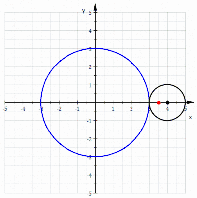 The red curve is a cyclocycloid (in this case an hypocycloid) drawn as the smaller black circle rolls around inside the larger blue circle (parameters are R = 5, r = -3, d = 5).
