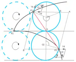- Now consider the velocity of . It can be seen as the sum of two components, the rolling velocity and the drifting velocity , which are equal in modulus because the circles roll without skidding. is parallel to , while is tangent to the lower circle at and therefore is parallel to . The rhombus constituted from the components and is therefore similar (same angles) to the rhombus because they have parallel sides. Then , the total velocity of , is parallel to because both are diagonals of two rhombuses with parallel sides and has in common with the contact point . Thus the velocity vector lies on the prolongation of . Because is tangent to the cycloid at , it follows that also coincides with the tangent to the lower cycloid at .