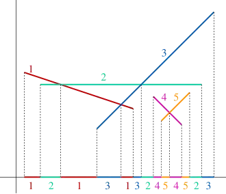 The same concept of a lower envelope can also be applied to functions that are only piecewise continuous or that are defined only over intervals of the real line; however, in this case, the points of discontinuity of the functions and the endpoints of the interval within which each function is defined add to the order of the sequence. For instance, a non-vertical line segment in the plane can be interpreted as the graph of a function mapping an interval of x values to their corresponding y values, and the lower envelope of a collection of line segments forms a Davenport–Schinzel sequence of order three because any two line segments can form an alternating subsequence with length at most four.