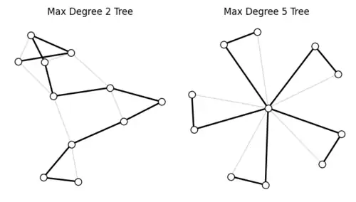 On the right, the central vertex must have degree at least 5 in any tree spanning this graph, so a 2 degree constrained tree cannot be constructed here.
