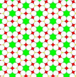 The rhombitrihexagonal tiling can be used as a circle packing, placing equal diameter circles at the center of every point. Every circle is in contact with four other circles in the packing (kissing number).[4] The translational lattice domain (red rhombus) contains six distinct circles.