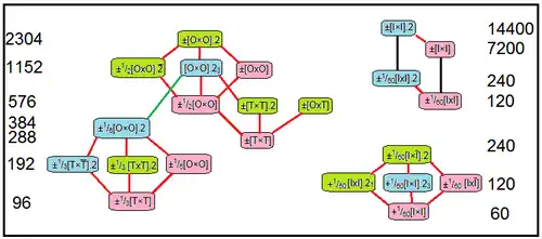 For cross-referencing, also given here are quaternion based notations by Patrick du Val (1964)[8] and John Conway (2003).[9] Conway's notation allows the order of the group to be computed as a product of elements with chiral polyhedral group orders: (T=12, O=24, I=60). In Conway's notation, a (±) prefix implies central inversion, and a suffix (.2) implies mirror symmetry. Similarly Du Val's notation has an asterisk (*) superscript for mirror symmetry.