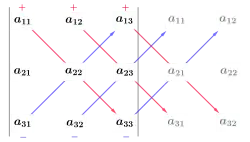 The rule of Sarrus is a mnemonic for the expanded form of this determinant: the sum of the products of three diagonal north-west to south-east lines of matrix elements, minus the sum of the products of three diagonal south-west to north-east lines of elements, when the copies of the first two columns of the matrix are written beside it as in the illustration. This scheme for calculating the determinant of a 3 × 3 matrix does not carry over into higher dimensions.
