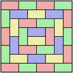Tatami are Japanese floor mats in the shape of a domino (1x2 rectangle). They are used to tile rooms, but with additional rules about how they may be placed. In particular, typically, junctions where three tatami meet are considered auspicious, while junctions where four meet are inauspicious, so a proper tatami tiling is one where only three tatami meet at any corner.[2] The problem of tiling an irregular room by tatami that meet three to a corner is NP-complete.[3]
