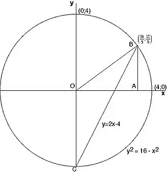 Geometrically, we may illustrate this method by drawing the circle x2 + y2 = 42 and the line y = 2x − 4. The pair of squares sought are then x02 and y02, where (x0, y0) is the point not on the y-axis where the line and circle intersect. This is shown in the adjacent diagram.