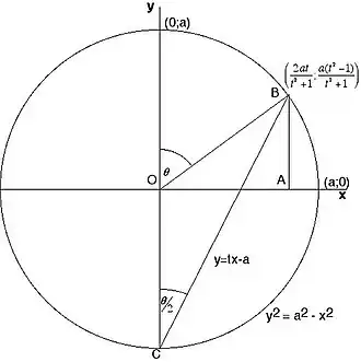 Therefore, we find that one of the summands is and the other is . The sum of these numbers is and each summand is a square. Geometrically, we have intersected the circle x2 + y2 = a2 with the line y = tx − a, as shown in the adjacent diagram.[2] Writing the lengths, OB, OA, and AB, of the sides of triangle OAB as an ordered tuple, we obtain the triple