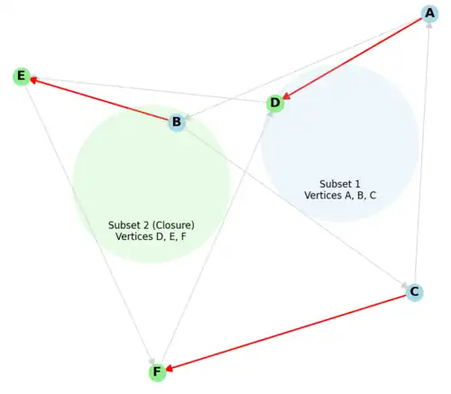 All edges crossing between the subsets go from Subset 1 to Subset 2, so a partition of the set into these subsets is a dicut. Subset 2 is a closure because there are no edges which exit it.