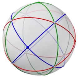 The edges of the spherical tetrakis hexahedron belong to six great circles, which correspond to mirror planes in tetrahedral symmetry. They can be grouped into three pairs of orthogonal circles (which typically intersect on one coordinate axis each). In the images below these square hosohedra are colored red, green and blue.