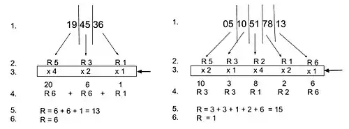 | Add the digits in blocks of two from right to left. The result must be divisible by 11.[2] | 627: 6 + 27 = 33 = 3 × 11. | |