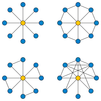 The stars are exactly the trees that have a universal vertex, and may be constructed by adding a universal vertex to an independent set. The wheel graphs may be formed by adding a universal vertex to a cycle graph.[2] The trivially perfect graphs are obtained from rooted trees by adding an edge connecting every ancestor–descendant pair in the tree. These always contain a universal vertex, the root of the tree. More strongly they may be characterized as the finite graphs in which every connected induced subgraph contains a universal vertex.[3] The connected threshold graphs form a subclass of the trivially perfect graphs, so they also contain a universal vertex. They may be defined as the graphs that can be formed by repeated addition of either a universal vertex or an isolated vertex (one with no incident edges).[4]