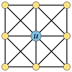 When a graph has a universal vertex, the vertex set consisting only of that vertex is a dominating set, a set that includes or is adjacent to every vertex. For this reason, in the context of dominating set problems, a universal vertex may also be called a dominating vertex.[10] For the strong product of graphs , the domination numbers and obey the inequalities This implies that a strong product has a dominating vertex if and only if both of its factors do; in this case the upper bound on its dominating number is one, and in any other case the lower bound is greater than one.[11]