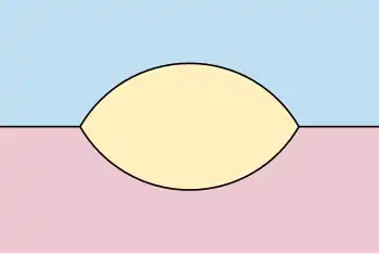 Researchers have also studied the dynamics of physical processes by which pairs of bubbles coalesce into a double bubble.[24][25] This topic relates to a more general topic in differential geometry of the dynamic behavior of curves and surfaces under different processes that change them continuously. For instance, the curve-shortening flow is a process in which curves in the plane move at a speed proportionally to their curvature. For two infinite regions separated by a line, with a third finite region between them, the curve-shortening flow on their boundaries (rescaled to preserve the area of the finite region) converges towards a limiting shape in the form of a degenerate double bubble: a vesica piscis along the line between the two unbounded regions.[26]