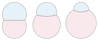 Plateau's laws state that any minimum area piecewise-smooth shape that encloses any volume or set of volumes must take a form commonly seen in soap bubbles in which surfaces of constant mean curvature meet in threes, forming dihedral angles of 120° ( radians).[2] In a standard double bubble, three patches of spheres meet at this angle along a shared circle. Two of these spherical surfaces form the outside boundary of the double bubble and a third one in the interior separates the two volumes from each other. In physical bubbles, the radii of the spheres are inversely proportional to the pressure differences between the volumes they separate, according to the Young–Laplace equation.[3] This connection between pressure and radius is reflected mathematically in the fact that, for any standard double bubble, the three radii , , and of the three spherical surfaces obey the equation where is the smaller radius of the two outer bubbles.[4] In the special case when the two volumes and two outer radii are equal, calculating the middle radius using this formula leads to a division by zero. In this case, the middle surface is instead a flat disk, which can be interpreted as a patch of an infinite-radius sphere. The double bubble theorem states that, for any two volumes, the standard double bubble is the minimum area shape that encloses them; no other set of surfaces encloses the same amount of space with less total area.[1]