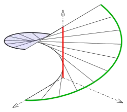In geometry, a surface S in 3-dimensional Euclidean space is ruled (also called a scroll) if through every point of S, there is a straight line that lies on S. Examples include the plane, the lateral surface of a cylinder or cone, a conical surface with elliptical directrix, the right conoid, the helicoid, and the tangent developable of a smooth curve in space.