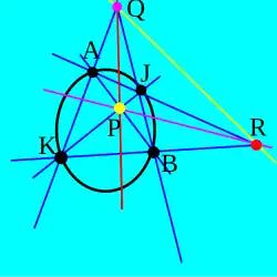 Let C be a conic in PG(2, F) where F is a field not of characteristic two, and let P be a point of this plane not on C. Two distinct secant lines to the conic, say AB and JK determine four points on the conic (A, B, J, K) that form a quadrangle. The point P is a vertex of the diagonal triangle of this quadrangle. The polar of P with respect to C is the side of the diagonal triangle opposite P.[24]