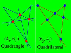 A set of m points and n lines is called an (mc, nd) configuration if c of the n lines pass through each point and d of the m points lie on each line. The dual of an (mc, nd) configuration, is an (nd, mc) configuration. Thus, the dual of a quadrangle, a (43, 62) configuration of four points and six lines, is a quadrilateral, a (62, 43) configuration of six points and four lines.[4]