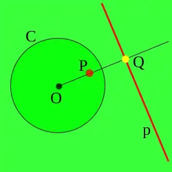 In the Euclidean plane, fix a circle C with center O and radius r. For each point P other than O define an image point Q so that OP ⋅ OQ = r2. The mapping defined by P → Q is called inversion with respect to circle C. The line p through Q which is perpendicular to the line OP is called the polar[22] of the point P with respect to circle C.