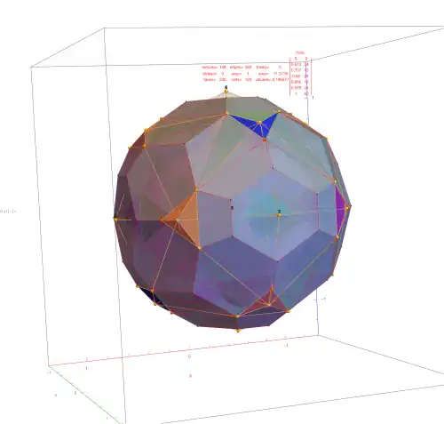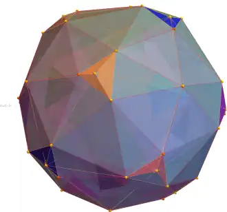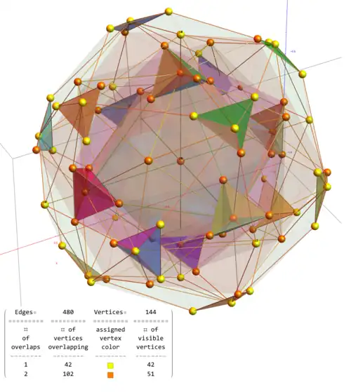 ![]() 3D Visualization of the hull of the dual snub 24-cell, with vertices colored by overlap count: The (42) yellow have no overlaps. The (51) orange have 2 overlaps. The (18) sets of tetrahedral surfaces are uniquely colored. |