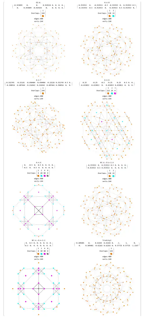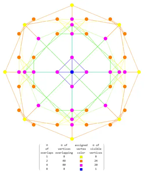 ![]() 2D projection of the dual snub 24-cell with color coded vertex overlaps ![]() 2D Projections to selected Coxeter Planes |