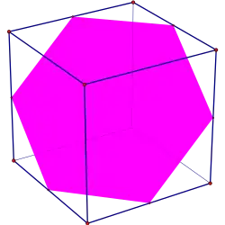 There is no simple convex polyhedron with three triangle faces, three pentagon faces, and no other faces. That is, it is impossible to have a simple convex polyhedron with , and for . However, Eberhard's theorem states that it should be possible to form a simple polyhedron by adding some number of hexagons, and in this case one hexagon suffices: bisecting a cube on a regular hexagon passing through six of its faces produces two copies of a simple roofless polyhedron with three triangle faces, three pentagon faces, and one hexagon face. That is, setting suffices in this case to produce a realizable combination of face counts.[5]