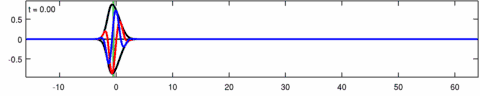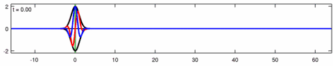 Animation of a wave-packet solution of the Eckhaus equation. The blue line is the real part of the solution, the red line is the imaginary part and the black line is the wave envelope (absolute value). Note the asymmetry in the envelope for the Eckhaus equation, while the envelope – of the corresponding solution to the linear Schrödinger equation – is symmetric (in ). The short waves in the packet propagate faster than the long waves.