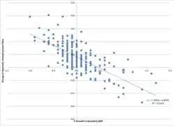 For example, consider Okun's law, which relates GDP growth to the unemployment rate. This relationship is represented in a linear regression where the change in unemployment rate () is a function of an intercept (), a given value of GDP growth multiplied by a slope coefficient and an error term, :