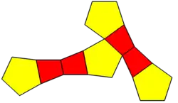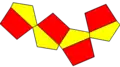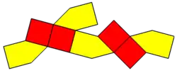The first name is from the regular-faced gyrobifastigium but elongated with 4 triangles expanded into pentagons. The name of the gyrobifastigium comes from the Latin fastigium, meaning a sloping roof.[1] In the standard naming convention of the Johnson solids, bi- means two solids connected at their bases, and gyro- means the two halves are twisted with respect to each other. The gyrobifastigium is first in a series of gyrobicupola, so this solid can also be called an elongated digonal gyrobicupola. Geometrically it can also be constructed as the dual of a digonal gyrobianticupola. This construction is space-filling.