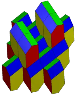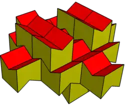 Like the gyrobifastigium, it can self-tessellate space. Polyhedra are tessellated by translation in the plane, and are stacked with alternate orientations. The cross section of the polyhedron must be square or rhombic, while the roof angle is free, and can be negative, making a concave polyhedron. Rhombic forms require chiral (mirror image) polyhedral pairs to be space-filling.