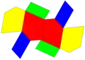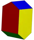 The second name, gabled rhombohedron, is from Michael Goldberg's paper on space-filling octahedra, model 8-VI, the 6th of at least 49 space-filling octahedra.[2] A gable is the triangular portion of a wall between the edges of intersecting roof pitches.