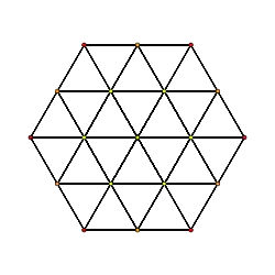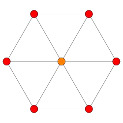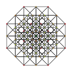 ![]() Orthogonal projection inside Petrie polygon Orange vertices are doubled, yellow have 4, and the green center has 8 | |