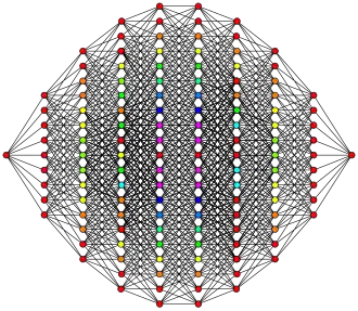 ![]() This 9-cube graph is an orthogonal projection. This orientation shows columns of vertices positioned a vertex-edge-vertex distance from one vertex on the left to one vertex on the right, and edges attaching adjacent columns of vertices. The number of vertices in each column represents rows in Pascal's triangle, being 1:9:36:84:126:126:84:36:9:1. |