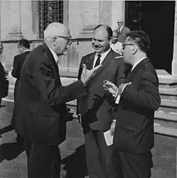 ![]() The International Symposium on Algebraic Geometry held in Rome in 1965. Enrico Bompiani talking to Giovanni Battista Rizza and Vittorio Dalla Volta. | |