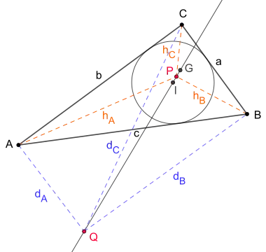 The equal detour point, isoperimetric point, the incenter and the Gergonne point of a triangle are collinear, that is all four points lie on a common line. Furthermore, they form a harmonic range (see graphic on the right).[3]