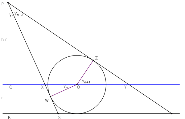 Line QXOY is parallel to the baseline and passes through O, the center of the incircle of PST, which is tangent to the rays at W and Z. Also, line PQ has length , and line QR has length , the radius of the incircle.
