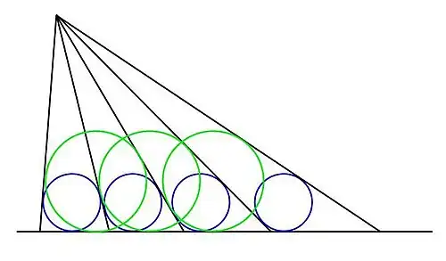 In geometry, the equal incircles theorem derives from a Japanese Sangaku, and pertains to the following construction: a series of rays are drawn from a given point to a given line such that the inscribed circles of the triangles formed by adjacent rays and the base line are equal. In the illustration the equal blue circles define the spacing between the rays, as described.