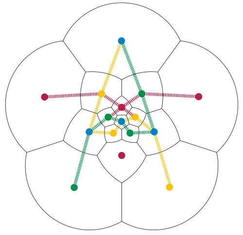 The dual graph of the Errera graph is a fullerene[1] with 30 vertices, designated in the chemistry literature as C30(D5h)[5] or F30(D5h)[6] to indicate its symmetry and distinguish it from other 30-vertex fullerenes. This shape also plays a central role in the construction of higher-dimensional fullerenes.[6]