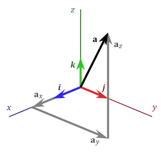 where a1, a2, a3 are called the vector components (or vector projections) of a on the basis vectors or, equivalently, on the corresponding Cartesian axes x, y, and z (see figure), while a1, a2, a3 are the respective scalar components (or scalar projections).