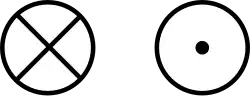 On a two-dimensional diagram, a vector perpendicular to the plane of the diagram is sometimes desired. These vectors are commonly shown as small circles. A circle with a dot at its centre (Unicode U+2299 ⊙) indicates a vector pointing out of the front of the diagram, toward the viewer. A circle with a cross inscribed in it (Unicode U+2297 ⊗) indicates a vector pointing into and behind the diagram. These can be thought of as viewing the tip of an arrow head on and viewing the flights of an arrow from the back.