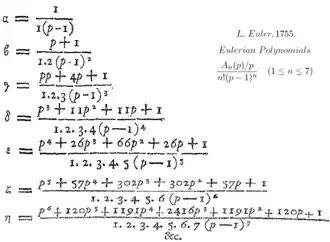- ↑ Qi, Feng; Guo, Bai-Ni (2017-08-01). "Explicit formulas and recurrence relations for higher order Eulerian polynomials". Indagationes Mathematicae. 28 (4): 884–891. doi:10.1016/j.indag.2017.06.010. ISSN 0019-3577.