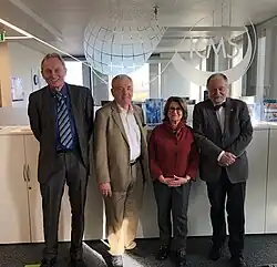 Four EMS Presidents: Volker Mehrmann (2019–2023), Jean-Pierre Bourguignon (1995-1998), Marta Sanz-Solé (2011–2014), and Pavel Exner (2015–2018) at EMS 30th anniversary celebration at International Centre for Mathematical Sciences in Edinburgh