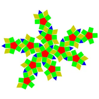This polyhedron can be dissected into a central rhombic triacontahedron surrounded by: 30 rhombic prisms, 20 tetrahedra, 12 pentagonal pyramids, 60 triangular prisms.