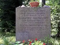 In 1939, Hausdorff asked the mathematician Richard Courant, in vain, for a research fellowship to be able to emigrate into the USA. In mid-1941, the Bonn Jews began to be deported to the "Monastery for Eternal Adoration" in Endenich, Bonn, from which the nuns had been expelled. Transports to death camps in the east occurred later. After Hausdorff, his wife, and his wife's sister, Edith Pappenheim (who was living with them), were ordered in January 1942 to move to the Endenich camp, the three died by suicide on 26 January 1942 by taking an overdose of veronal.[7] Their final resting place is located on the cemetery Poppelsdorf in Bonn. In the time between their placement in temporary camps and his suicide, he gave his handwritten Nachlass to the Egyptologist and presbyter Hans Bonnet, who saved as much of them as possible, even despite the destruction of his house by a bomb.