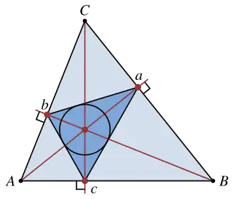 The orthic triangle, with vertices at the base points of the altitudes of the given triangle, has the smallest perimeter of all triangles inscribed into an acute triangle, hence it is the solution of Fagnano's problem. Fagnano's original proof used calculus methods and an intermediate result given by his father Giulio Carlo de' Toschi di Fagnano. Later however several geometric proofs were discovered as well, amongst others by Hermann Schwarz and Lipót Fejér. These proofs use the geometrical properties of reflections to determine some minimal path representing the perimeter.