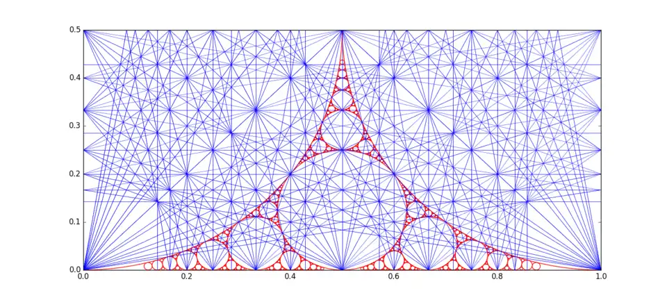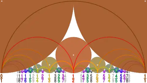 Ford circles appear also in the Apollonian gasket (0,0,1,1). The picture below illustrates this together with Farey resonance lines.[21]