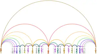 Comparison of Ford circles and a Farey diagram with circular arcs for n from 1 to 9. Each arc intersects its corresponding circles at right angles. In the SVG image, hover over a circle or curve to highlight it and its terms.