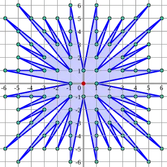 Reflecting this shape around the diagonal and main axes generates the Farey sunburst, shown below. The Farey sunburst of order n connects the visible integer grid points from the origin in the square of side 2n, centered at the origin. Using Pick's theorem, the area of the sunburst is 4(|Fn| 1), where |Fn| is the number of fractions in Fn.