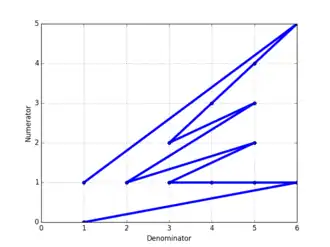 Plotting the numerators versus the denominators of a Farey sequence gives a shape like the one to the right, shown for F6.