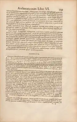 Diophantus's major work is the Arithmetica, of which only a portion has survived.[23] Fermat's conjecture of his Last Theorem was inspired while reading a new edition of the Arithmetica,[24] that was translated into Latin and published in 1621 by Claude Bachet.[25][26]