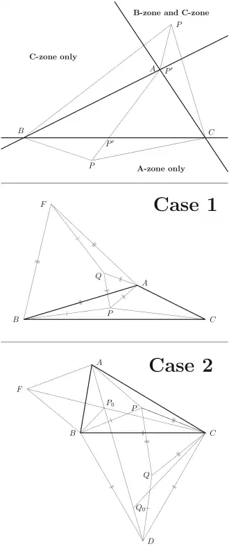 Let P be any point outside Δ. Associate each vertex with its remote zone; that is, the half-plane beyond the (extended) opposite side. These 3 zones cover the entire plane except for Δ itself and P clearly lies in either one or two of them. If P is in two (say the B and C zones’ intersection) then setting implies by the dogleg rule. Alternatively if P is in only one zone, say the A-zone, then where P' is the intersection of AP and BC. So for every point P outside Δ there exists a point P' in Ω such that
